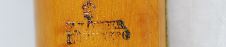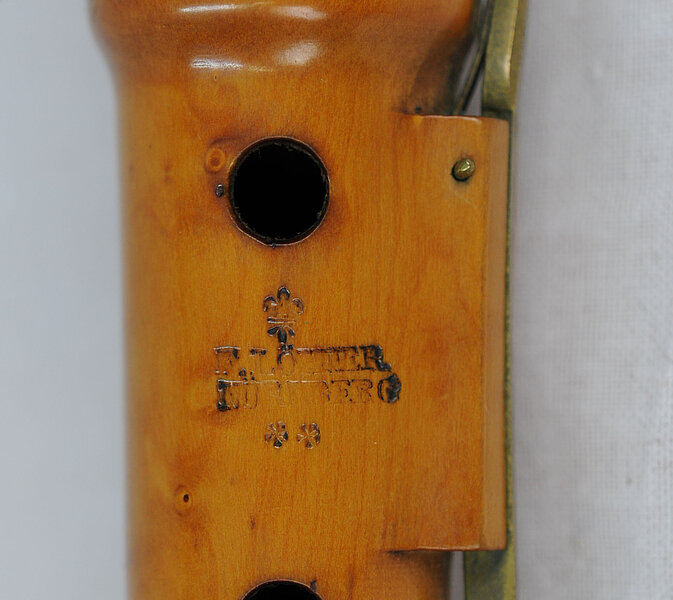 Signatur: Brandmarke '[Lilie] | F.LÖHNER | NÜRNBERG | [2 fünfzackige Sterne] | D' am Ende des Fußes. unterhalb der cis1-Klappe. Dieselbe Brandmarke ohne die Stimmungsangabe 'D' am Anfang des Stimmstücks und am Anfang des Mittelstücks, zwischen 4. und 5. Griffloch.