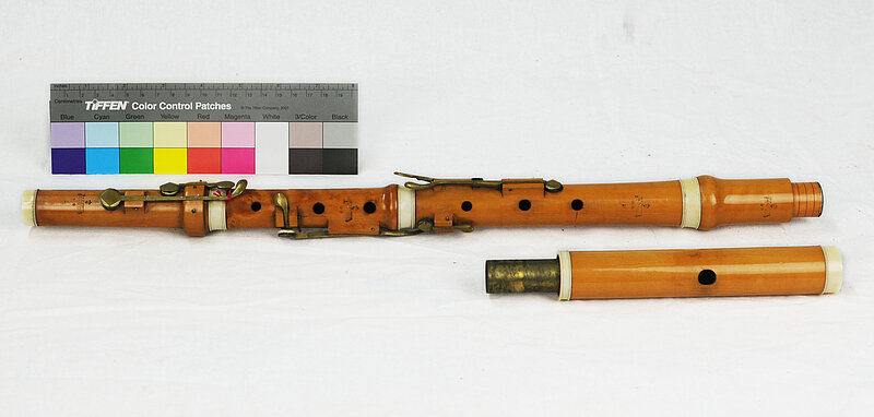Rohrteile: Kopf und Stimmstück, Mittelstück, Herzstück und Fuß. Verlängerungsrohr am Kopfende aus Messing. Zapfen am Anfang des Stimmstücks aus Buchsbaum, mit Messing gefüttert, darauf 3 rote Ringe