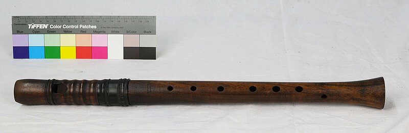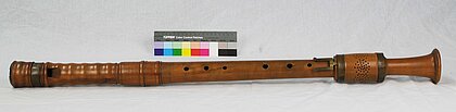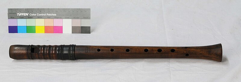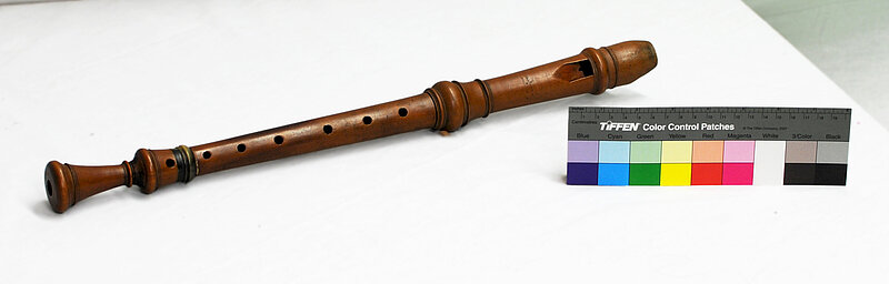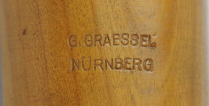 Signatur (Schlagstempel): "G. GRAESSEL | NÜRNBERG" auf dem Unterstück, oberhalb des 1. Grifflochs . Rohr wohl aus Ahorn, 2-teilig. Bohrung konisch abnehmend. Rohrlänge 44,5 cm, Abstand Labium bis zum Ende des Oberstücks: 8,8 cm. Tiefster spielbarer Ton: g. Mundstück: Kurzer Schnabel am Oberstück. Labiumhöhe: 0,49 cm, Labiumbreite: 1,10 cm. Grifflöcher (alle auf dem Unterstück): 1 hinterständiges Griffloch, über dem 1. vorderständigen Griffloch liegend. 6 vorderständige Grifflöcher in gerader Reihe, 2 seitlich in die Wandung des Rohrs gebohrte Grifflöcher.