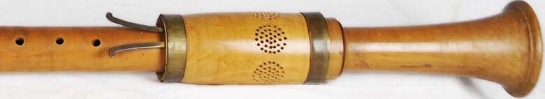 Grifflöcher: Ein hinterständiges Griffloch auf dem Mittelstück für Finger (links 1) oder für Finger (rechts 1), oberhalb des 1. vorderständigen Grifflochs liegend. 6 vorderständige Grifflöcher, in gerader Reihe. auf dem Mittelstück für Finger (links 2-4) und (rechts 2-4), oder umgekehrt. Ein seitlich in die Wandung des Fußsockels schräg gebohrtes Griffloch, durch den drehbaren Fuß entweder für Finger (rechts 5) oder für Finger (links 5).