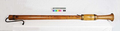 Signatur (Schlagstempel): "G. GRAESSEL | NÜRNBERG" auf dem Oberstück, unterhalb des Wellenprofils. Rohr aus Kirschbaum mit Windkapsel, 3-teilig. Bohrung konisch abnehmend. Rohrlänge 90.5 cm, Abstand Labium bis zum Ende des Oberstücks: 23,4 cm. Tiefster spielbarer Ton: g. Oberstück (mit Windkapsel) und Unterstück. Windkapsel mit Anblasloch an der Seite und Messingzwinge am Ende. Pflock aus Kirsche. Labium rechteckig. Labiumhöhe um 0,77 cm, Labiumbreite um 1,82 cm. Grifflöcher (alle am Unterstück): 1 hinterständiges Griffloch über dem 1. vorderständigen Griffloch liegend. 6 vorderständige Grifflöcher in gerader Reihe. Klappe: 1 zweiflügelige, offene Klappe. Deckel (mit Lederbelag) aus Messing. Fingerhebel aus Messing. Feder aus Messing. Lagerung in einer Geleitrinne und 2 Messingstegen. Tonnenkapsel aus Kirschbaum, verziert mit kreisförmig angelegten Löchern. Messingzwingen am Anfang und Ende.