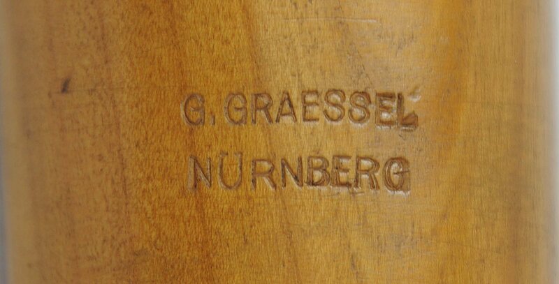 Signatur (Schlagstempel): "G. GRAESSEL | NÜRNBERG" am Oberstück, in der Mitte zwischen Labium und dem ersten vorderständigen Griffloch. Rohr aus Kirsche mit Windkapsel, 3-teilig. Bohrung konisch abnehmend, zum Ende des Fußes hin sich wieder erweiternd. Rohrlänge (ohne S): 137,8 cm, Abstand Labium bis zum Ende des Oberstücks: 86,1 cm. Tiefster spielbarer Ton: c. Rohrteile: Oberstück (mit Windkapsel) und Fuß. S aus Messing mit Lippenstütze aus dunklem Horn. Windkapsel mit Steckloch in der Oberseite für das S. Am Ende eine Messingzwinge. Pflock aus Kirsche. Labium rechteckig, Labiumhöhe 1,15 cm, Labiumbreite 2,57 cm. Grifflöcher (alle auf dem Oberstück): 1 hinterständiges Griffloch, über dem 1. vorderständigen Griffloch liegend. 6 vorderständige Grifflöcher. Zweiflügelige offene Klappe. Deckel (mit Lederbelag) aus Messing. Fingerhebel und Feder aus Messing. Lagerung in einer Geleitrinne und 2 Messingstegen, Tonnenkapsel wohl aus Esche, verziert mit kreisförmig angelegten Löchern. Messingzwingen am Anfang und Ende.