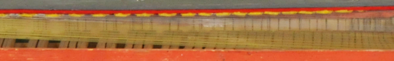 Gesamtlänge: 135,7 cm, Breite: 40,5 cm, Höhe mit Deckel: 12,4 cm. Deckel und Zargenaußenseiten grün bemalt, davon abgesetzt in roter Bemalung die Zargeninnenseiten, Klavierbacken und Werkzeugkasten. Der Rot-grün-Kontrast setzt sich bei den Klavieturbegrenzungsleisten und dem Hirnholz der Hebel fort. Alle Gehäuseteile und Tastenhebel aus Fichte, Untertastenbelag aus gebeizter Pflaume, Obertastenbelag aus gebeizter Birne.