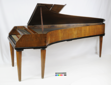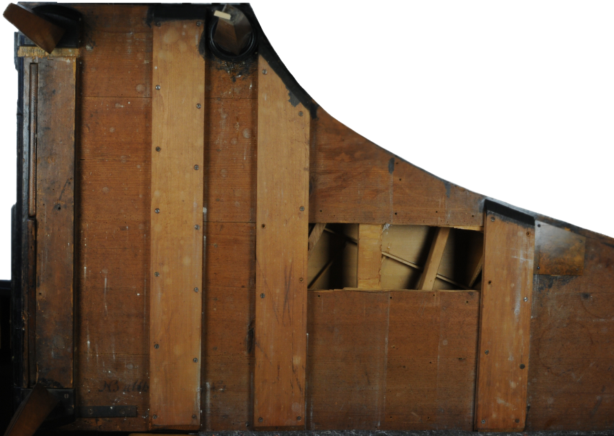Mehrere restaurorische Eingriffe: Die Nussbaum-Sockelleisten am Zargenende sind nicht, wie bei Eschler (1993, S. 93) angegeben, schwarz gebeizt, sondern mit schwarzem Schellack angestrichen. An der Front sieht man durch Abschabungen hindurch den wohl ursprünglichen hellen Lack (wohl auf Öl-Harz-Basis). Diese Lackierung war 1927 – siehe Foto bei Hermann (1927, S. 62) – noch nicht aufgetragen. Die Deckelstütze wurde gekürzt. Der Deckel aus Eiche ist nicht original (siehe die Deckel der Vergleichsinstrumente), war jedoch 1927 bereits angebracht, so auch das versenkbare Notenpult, für das die Nussbaumprofilleiste des Vorsatzbretts unterbrochen wurde. Die Deformation des Deckel ist bei Eschler (1993, S 120) bereits fotografisch dokumentiert. Die vierkantigen Nussbaum-Beine stammen wohl aus den 1930er Jahren. 1927 hatte das Instrument gedrechselte Beine (auch nicht original, nicht mehr vorhanden). Aus den 1930er Jahren stammen wohl die massiven Eingriffe am Korpusinneren und -boden. Ein Bodenstück wurde wohl v.a. wegen Wurmbefall ausgestemmt (siehe Bodenansicht), wohl aber auch, um Zugang zum Korpusinneren zu erhalten. Der Stimmstock, der sich aufgrund statischer Belastung gelöst hatte, wurde mit Schrauben (links an der Bass-Seite später abermals gerissen) und Holzdübeln durch die lange und die kurze Wand der Zargen befestigt.