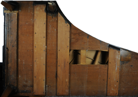 Mehrere restaurorische Eingriffe: Die Nussbaum-Sockelleisten am Zargenende sind nicht, wie bei Eschler (1993, S. 93) angegeben, schwarz gebeizt, sondern mit schwarzem Schellack angestrichen. An der Front sieht man durch Abschabungen hindurch den wohl ursprünglichen hellen Lack (wohl auf Öl-Harz-Basis). Diese Lackierung war 1927 – siehe Foto bei Hermann (1927, S. 62) – noch nicht aufgetragen. Die Deckelstütze wurde gekürzt. Der Deckel aus Eiche ist nicht original (siehe die Deckel der Vergleichsinstrumente), war jedoch 1927 bereits angebracht, so auch das versenkbare Notenpult, für das die Nussbaumprofilleiste des Vorsatzbretts unterbrochen wurde. Die Deformation des Deckel ist bei Eschler (1993, S 120) bereits fotografisch dokumentiert. Die vierkantigen Nussbaum-Beine stammen wohl aus den 1930er Jahren. 1927 hatte das Instrument gedrechselte Beine (auch nicht original, nicht mehr vorhanden). Aus den 1930er Jahren stammen wohl die massiven Eingriffe am Korpusinneren und -boden. Ein Bodenstück wurde wohl v.a. wegen Wurmbefall ausgestemmt (siehe Bodenansicht), wohl aber auch, um Zugang zum Korpusinneren zu erhalten. Der Stimmstock, der sich aufgrund statischer Belastung gelöst hatte, wurde mit Schrauben (links an der Bass-Seite später abermals gerissen) und Holzdübeln durch die lange und die kurze Wand der Zargen befestigt.