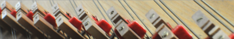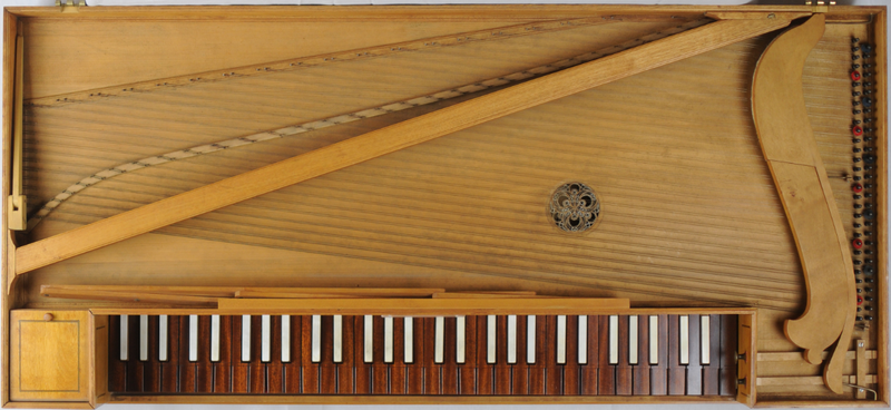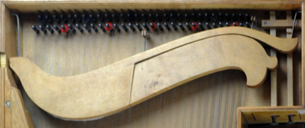 Saiten (einchörig), Besaitung original, durchgehend aus Stahl, von F' bis D umsponnen, ab Es blank. Länge F' 104,4 cm … f3 19,2 cm. – Mensur der Saitenpaare gleich (F'/Fis' 1,1 mm, G'/Gis' 1 mm, A'/B' 0,9, H'/C 0,8 etc., Es/E, 0,7, blank, abnehmend).