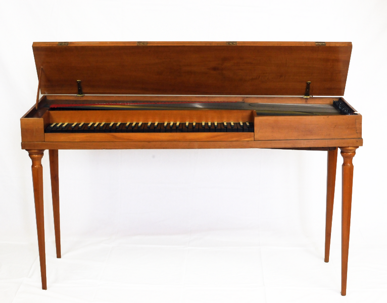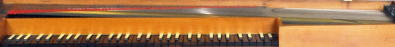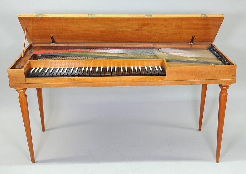 Rechteckiges Gehäuse, Klaviatur links, einspringend. Gesamtlänge mit Sockel 141,1 cm. Deckel, Zargen und Beine aus Kirschbaum; Rückwand, Unterboden, Tastenhebel aus Fichte; Tastenhebelböckchen aus Linde; Belag der Untertasten aus Ebenholz, Stirnkanten aus gebeiztem Birnbaum, Obertasten mit Knochenauflage. Werkzeugkasten (ohne Deckel) zwischen linker Zarge und Backe.