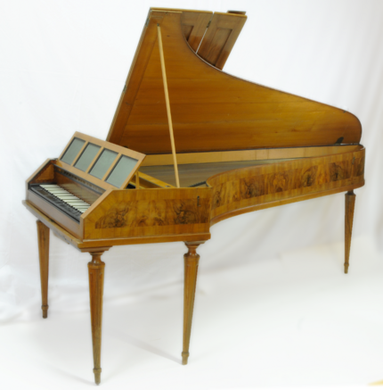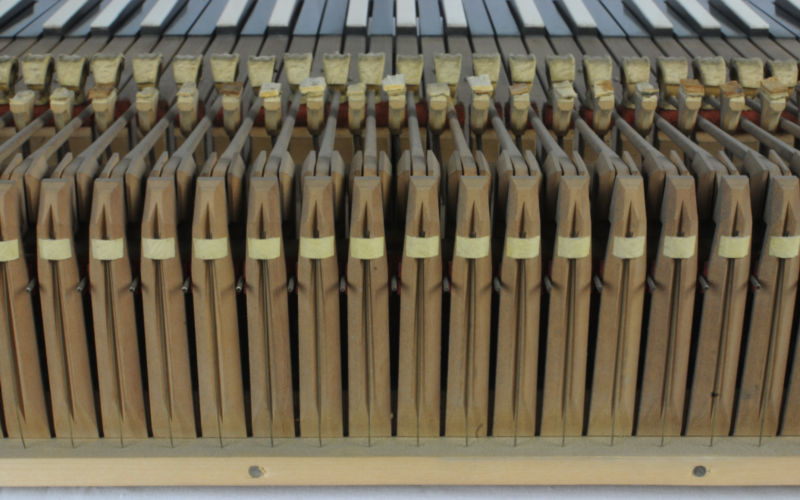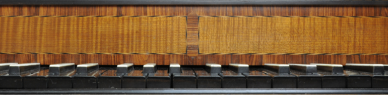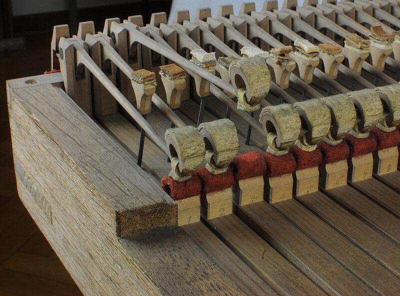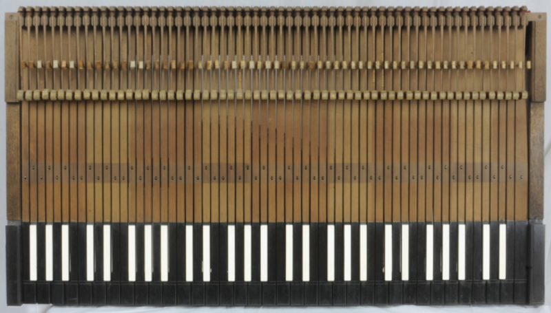 Klaviatur: Schwarz gebeizter Birnbaum für Backen und Obertasten, Knochenauflage bei den Obertasten; Untertasten mit Ebenholzauflage, Stirnkanten aus schwarz gebeizter Birne. Tastenhebel aus Fichte, Auflageböckchen aus Ahorn. Eingelassener Lederbelag an den Rückenenden der Hebel. Tastentiefgang ca. 0,55 cm. Tastenführung über Kanzellen (Messingstäbchen zwischen zwei Nussbaumleisten). Klaviaturrahmen aus Fichte, der die Klaviatur mit Mechanik erhöhende Schlitten aus Fichte, mit Seitenleisten aus Eiche.