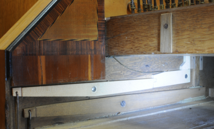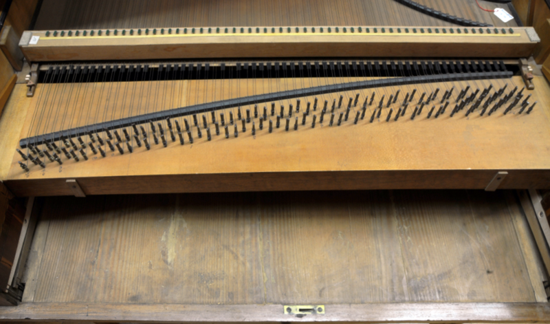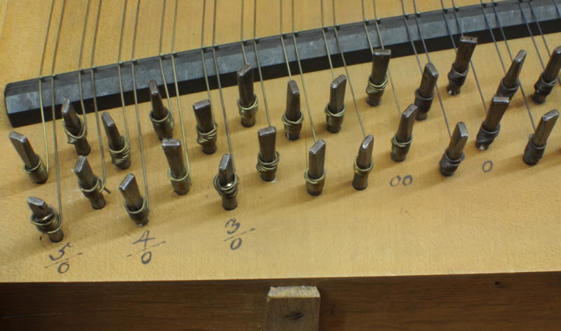 Stimmstock aus Eiche mit Ahornauflage. Stärke 5,3 cm, Tiefe konstant 19 cm. Vor den Wirbeln sind mit Tinte Saitenstärkennummern notiert (siehe Bild). Steg aus schwarz gebeiztem Obstholz, Höhe (Bass bis Diskant) 1–0,95 cm. Anhängeleiste entlang der geschweiften Hohlwand aus schwarz gebeiztem Nussbaum, Höhe (Bass bis Diskant) 1,11–0,72 cm.