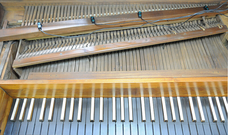 Obertasten aus schwarz gebeiztem Birnbaum mit Knochenauflage. In den Untertasten 3 Rillen.