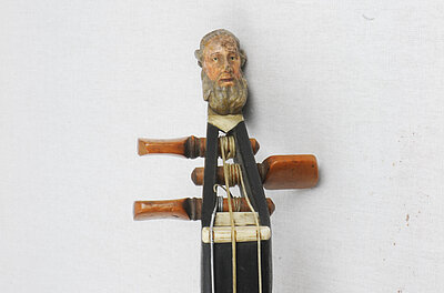 Halslänge: 104 mm. Griffbrett aus gebeiztem Ahorn, flach. Wirbelkasten aus Ahorn, darauf vollbärtiger Männerkopf aus Pappmarché.Wirbel aus Buchsbaum, im Zentrum der Schmalseite mit einem Auge aus Ebenholz.