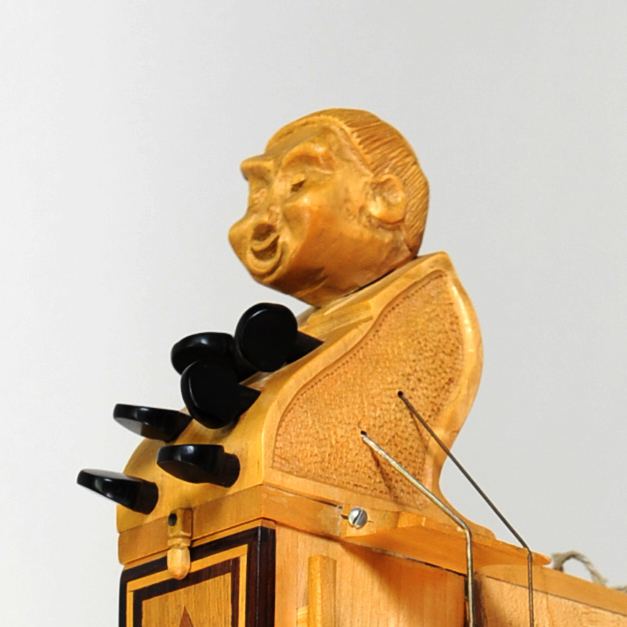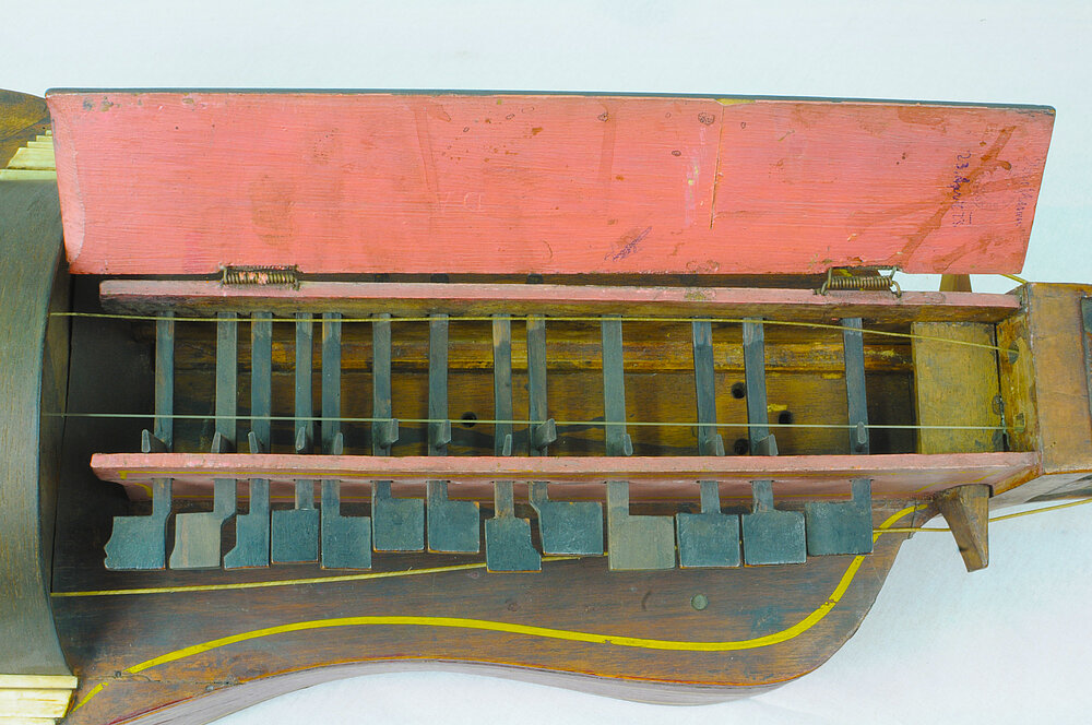 Tangentenkasten aus Nußbaum, innen mit Versteifungsleisten aus Fichte an den Corpus geleimt. Die Außenwände rosa bemalt, mit gelben Zierstreifen an den Rändern. Deckel aus Nußbaum, mit Scharnieren an den Kasten befestigt. Die Außenseite schwarz geb., mit gelben Zierstreifen an den Rändern, innen rosa übermalt. 13 Tasten mit je 1 Tangente, nur an 1 Saite wirkend. Alles aus schwarz geb. Birnbaum. Diatonische Tonfolge.