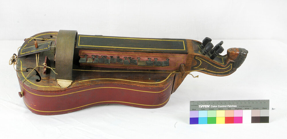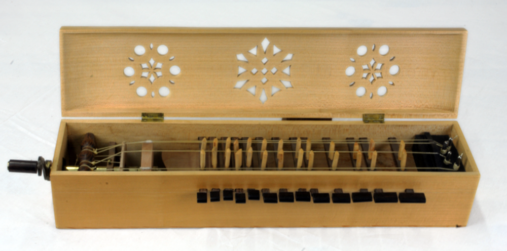 Keine Herstellersignatur, möglicherweise privater Eigenbau. Diatonisch. – Decke leicht gewölbt, mit drei einfachen Rosetten. Länge (ohne Kurbel) 46,6 cm, Breite 10 cm, Höhe (ohne Deckel) 7,5 cm, mit Deckel 9,3…9,8 cm. Ahornsteg. 4 Saiten, die äußeren Bordunsaiten, die inneren Melodiesaiten. Klingende Saitenlänge 34,5 cm. 13 Tasten mit parallelen Tangenten.