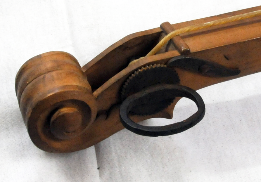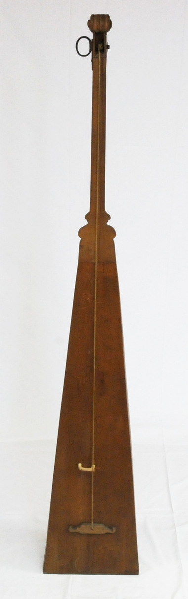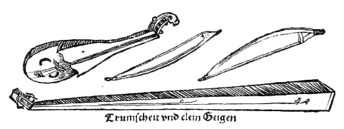 »Dieses alte, ganz einfache Bogeninstrument bestehet aus drei dünnen, sieben Schuh langen Brettern, die unten, wo das Instrument auf dem Fußboden aufstehet, sechs bis sieben Zoll, oben aber kaum zwei Zoll breit und in der Form eines Triangels zusammengeleimt sind, so daß das Korpus, welches oben eine Art von Wirbelkasten hat, von unten bis oben verjüngt zuläuft. Eins von diesen drei Brettern macht den Sangboden aus, der mit einigen Schalllöchern versehen und mit einer einzigen, etwas starken Darmsaite bezogen ist. Bei dem Spielen stellt man das Instrument schief vor sich hin und stemmt den obern Teil desselben gegen die Brust. Mit dem Daumen der linken Hand berührt der Spieler die Saite da, wo die zu greifenden Töne liegen, ganz gelinde und ungefähr ebenso wie bei dem Flautino oder Flageolet auf der Geige, während mit der rechten Hand die Saite mit dem Bogen angestrichen wird. Der eigentümliche Ton dieses Instruments, der dem Tone einer gedämpften Trompete gleicht, wird durch den besondern Steg hervorgebracht, auf welchem die Saite unten auf dem Resonanzboden ruhet. Dieser Steg hat beinahe die Gestalt eines kleinen Schuhes, der vorn ganz niedrig und dünne, hinten hingegen höher und stärker ist. Auf dem hintern Teile desselben liegt die Saite auf und verursacht, wenn sie angestrichen wird, durch ihre Schwingungen, daß sich der vordere und leichte Teil des Steges auf dem Sangboden auf und nieder bewegt, wodurch der schnarrende und der gedämpften Trompete ähnliche Ton hervorgebracht wird!« –