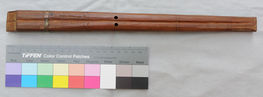 Ein Stück Zwetschge, 5 mm breites, auf der Rückseite zusammengelötetes Messingband 5,8 cm vom Anblasende, 7 mm breites eingeritztes Bandornament 11,1 cm vom Anblasende entfernt. Länge 35,3 cm, Breite 3–2,1 cm, Labiumkante bis Austritt (beide Pfeifen) 32,1 cm.