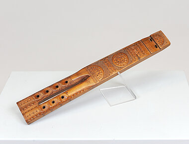 kroatisch, 1980er Jahre (?). Aus einem Stück Ahorn, Länge 30,8 cm, Breite 3,5–4,5 cm, Labiumkante bis Austritt links 26,7 rechts 26,5 cm. Labiumkante rechteckig. Kanäle gebohrt, 11 mm. Standardisierte Reliefschnitzerei mit Bändern und Rosettenmustern. In Masse gefertigt. Drei Grifflöcher links, vier rechts, alle senkrecht zur Rohrachse gebohrt.