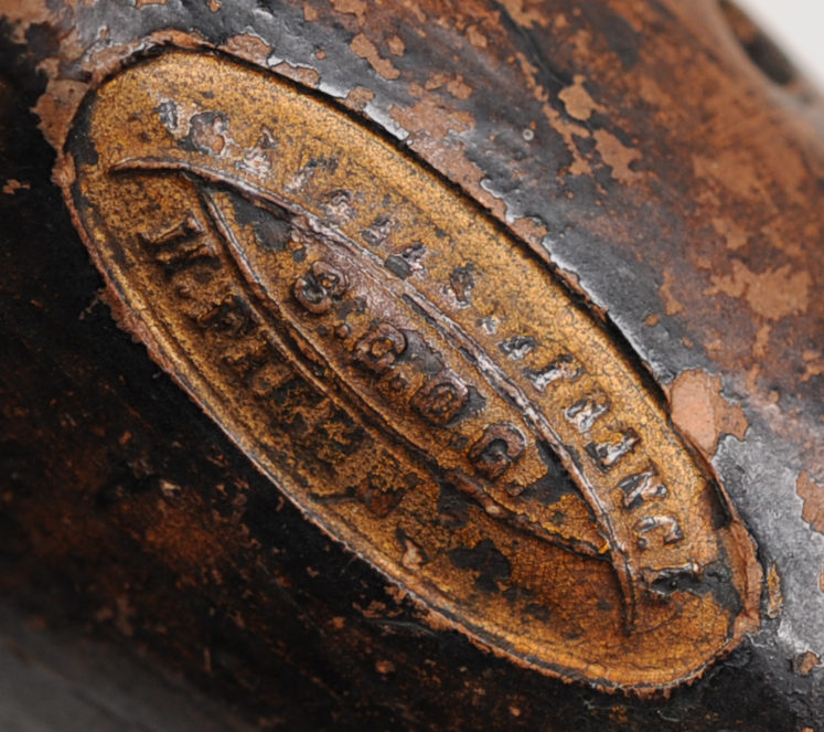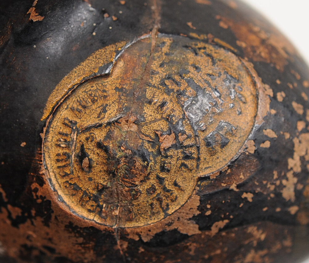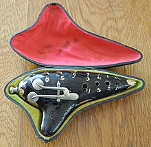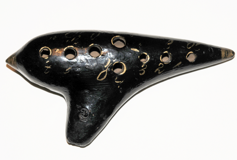 Wien, vor 1938 (nach Eschler 1996). "Wiener Modell". Rübenform, mit Spalte und Labium in kreisförmigem Aufschnitt an der Unterseite. Gebrannter Ton, schwarz glasiert, Goldlackbemalung (Enden, Lochumrandungen, Stempel, Grifflochbezeichnungen). Gefäßlänge 17,6 cm, max. Breite bis Anblas-Ende 8,50 cm, max. Höhe 4,25 cm. Auf dem spitz zulaufenden Ende spielerseitig die Stempelung MADE IN AUSTRIA, am stumpfen Ende zwei ineinanderlaufende runde Stempel mit Laub- und Wappenmotiv (nicht identifiziert). Am Anblas-Ende eingestempelt der Stimmton D. Grifflöcher mit Zahlen bezeichnet. Acht Fingergrifflöcher auf der Ober-, zwei Daumenlöcher auf der Unterseite. 1: d (rechts 5), 2: e (r 4), 3: f (r 3), 4: g (r 2), 5: a (links 4), 6: h (l 3), 7: c (l 2), 8: d (l Daumen), 9: e (l 5), 10: f (r Daumen). Tiefster spielbarer Ton c1. Provenienz: Sammlung Ulrich Rück. – Vergleichsinstrument etwa Museum für Musikinstrumente der Universität Leipzig.