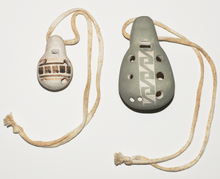"Sweet Potatoe Ocarinas", die um den Hals gehängt werden. Kleine weiße Okarina mit 4-Loch-System, aufgemaltes Muster; größere weiße Ocarina, oberflächig grau eingefärbt, mit 7-Loch-System, Einritzung auf der Rückseite (nicht identifizierbar).