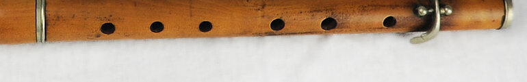 6 vorderständige Grifflöcher, alle auf dem Fuß für Finger (links 2–4) und (rechts 2–4).