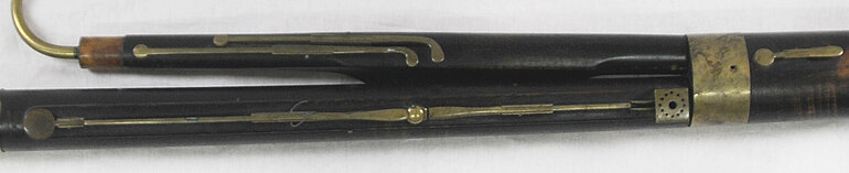 Grifflöcher: 1 hinterständiges Griffloch auf dem Stiefel für Finger (rechts 1), zwischen dem 4. und 5. vorderständigen Griffloch liegend. 6 vorderständige Grifflöcher. 1-3 auf dem Flügel für Finger (links 2-4). 4-6 auf dem Stiefel für Finger (rechts 2-4). Alle Grifflöcher schräg in die Wandung des Rohres gebohrt.
