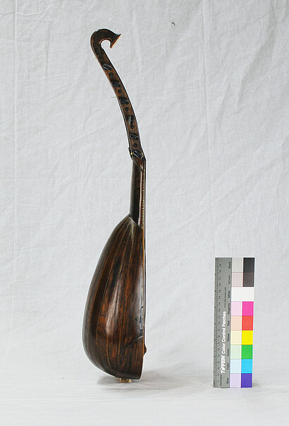 Hals mit Griffbrett an den Oberklotz genagelt und geleimt, im Querschnitt halbkreisförmig, an beiden Seiten mit Streifen aus Knochen und Palisander Zupfinstrumente belegt. Halsstärke und Griffbrettbreite zum Wirbelkasten hin abnehmend. 13 Bunde (10 aus Messing auf dem Griffbrett, 3 aus Palisander auf der Decke). Maße: Länge des Halses um 14,5 cm, Halsstärke vom Wirbelbrett zum Corpus hin: 1,56–2,65 cm, Griffbrettbreite vom Wirbelbrett zum Corpus hin 2,60–3.45 cm.