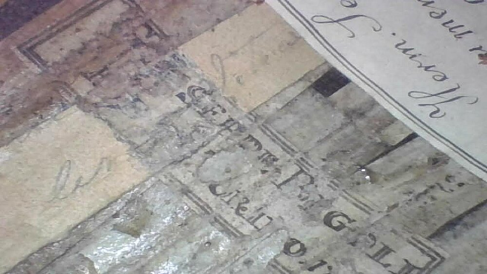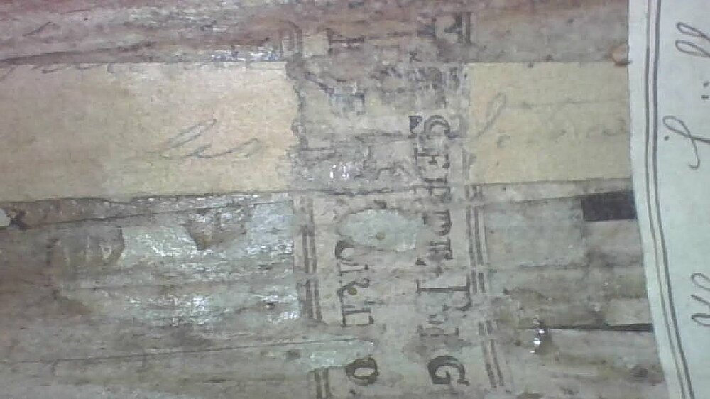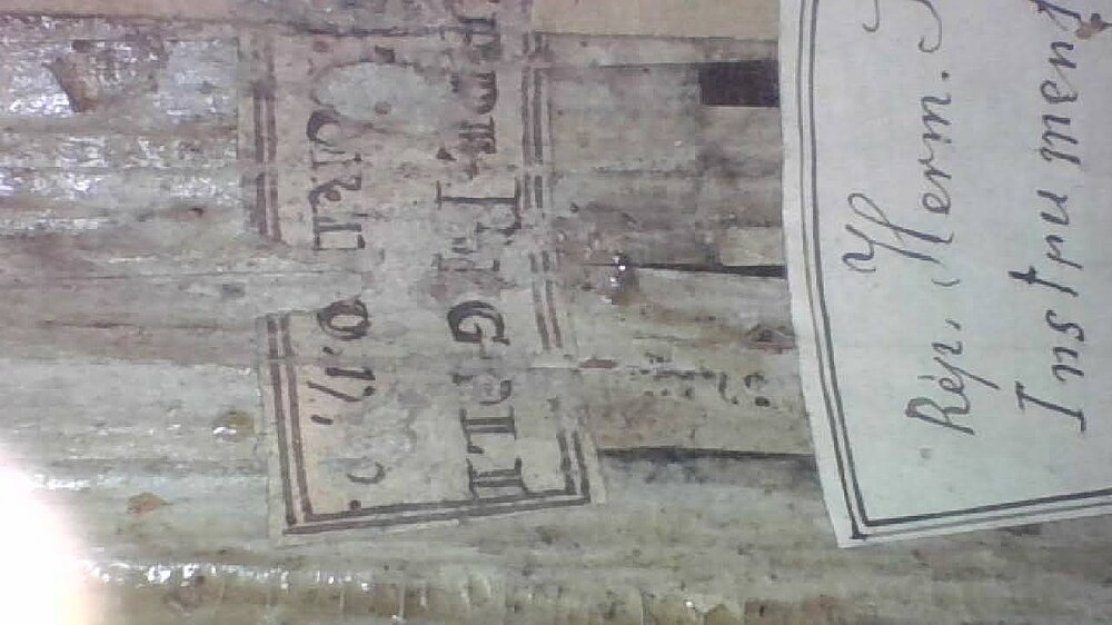 Signatur: Zwei Zettel auf der Muschel im Korpusinneren. Gedruckter, stark beschädigter Zettel des Erbauers: "GIUSEPPE BIGOLI (2., 4. und 5. Buchstabe nicht eindeutig lesbar) | "ME FECIT TORINO 177.*."