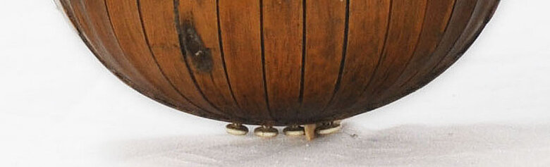 Muschel aus 13 ungekehlten Spänen aus Jacaranda, getrennt durch Adern aus Ahorn und Jacaranda. Darauf, am Korpusende, die Kappe, im oberen Drittel mit Adern wie oben. Kappenauslauf. Größte Wölbungshöhe: 9,2 cm
