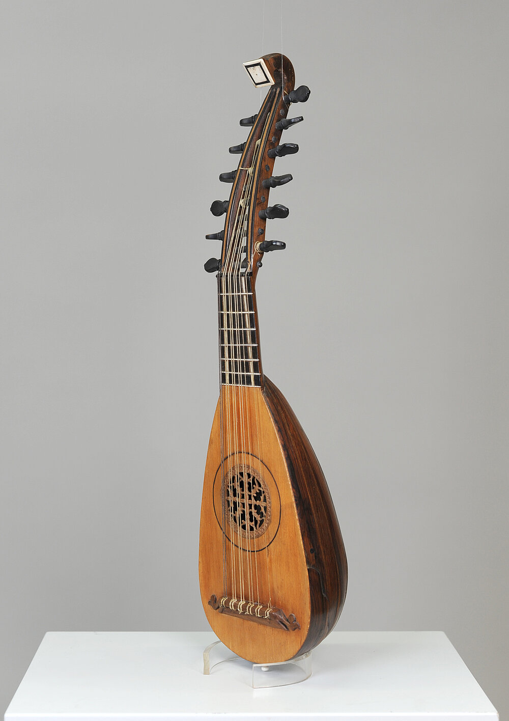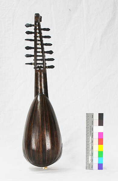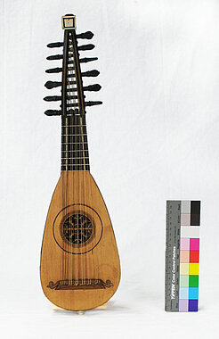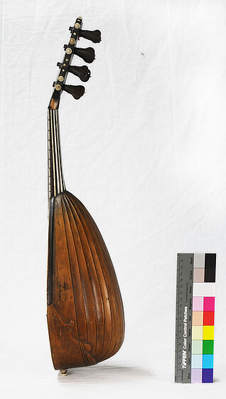 Wirbelbrett aus Ahorn, an den Seiten wellenförmig ausgeschnitten. Auf beiden Seiten mit Palisander furniert und mit eingelegten Knochenstreifen am Rand und im Zentrum. An den Seiten Verzierungsknöpfchen aus gedrechseltem Knochen, 8 hinterständige Wirbel aus (wohl) Palisander. Maße: Größte Breite Wirbelbrett am Ende: 6,30 cm – Obersattel aus Palisander. Saitenbefestigung: 4 aus Knochen gedrechselte Knöpfchen auf eine Knochenplatte gesteckt. Alles am Unterklotz auf der Kappe befestigt. Besitung: 4 zweisaitige Chöre (Schausaiten). Schwingende Saitenlänge 33,1 cm, Gesamtlänge des Instruments: um 58,0 cm