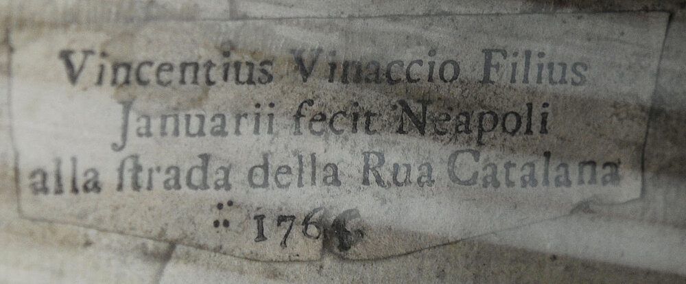 Signatur: Gedruckter Zettel auf der Muschel im Korpusinneren: Vincentius Vinnaccio Filius | Januarii fecit Neapoli | alla strada della Rua Catalana | :: 1766". Die letzte Ziffer handgeschrieben.