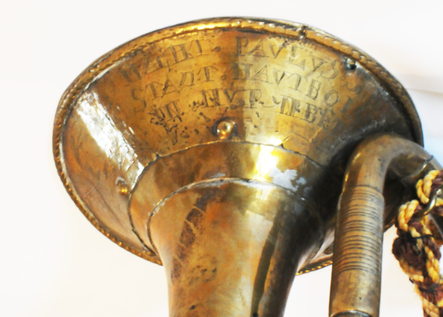 Rohr aus Messing, zwischen den Rohren ein Keil aus Fichte mit blau-weißer Kordelumwickelung. Gesamte Rohrlänge mit Setzstück 226 cm, ohne 219,2 cm. Höhe (max.): 72,5 cm. Stürze eng und stark ausladend, gezahnte Lötnaht. Ursprüngliche Verbindung von U-Bogen und Stürze via Draht durch Öse und Loch in der Stürze; jetzt gelötet. Stürzenkranz mit sechs Nieten, Verzierungen mit gravierten Blatt- und Blütenmustern, Stürzenkranz zu einem späteren Zeitpunkt neu auf die Stürze aufgelötet. Gegossene Kranzborte mit gezacktem Blattmuster. Durchmesser der Schallöffnung: 12,7 cm.