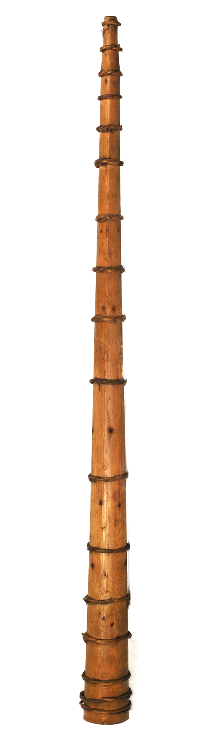 Längstrompete aus Holz ("Hirtenhorn" bzw. Signalhorn) aus Südtirol, Durholzer See (Lago Valdurna), Sarntal bei Bozen. Aus der Sammlung Rück, 1956 vom Sammler erworben. Ohne Herstellervermerk.