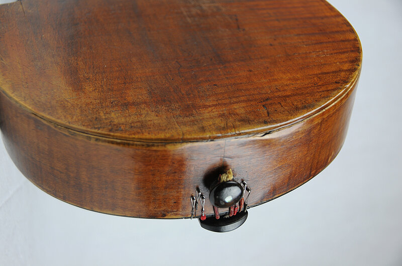 Steg modern. Saitenhalter aus Ebenholz, mit einer Darmschnur an einem Ebenholzknöpfchen befestigt.