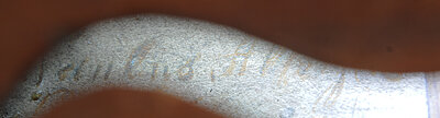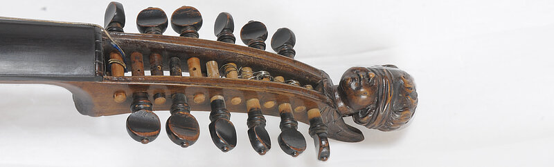 Griffbrett aus Fichte, auch an den Seiten mit Ebenholzauflage. Griffbrettlänge um 27,5 cm, Griffbrettbreiten: 3,30 bis 5,05 cm. Durchbrochener Wirbelkasten aus Ahorn. Engelskopf mit Flügeln und verbundenen Augen. 12 Wirbel aus gebeiztem Buchsbaum. Wirbelkastenlänge um 13,5 cm, Wirbelkastenbreiten 2,62 bis 3,42 cm. Obersattel aus Ebenholz für die Resonanzsaiten aus Elfenbein in der Rückseite des Wirbelkastens.