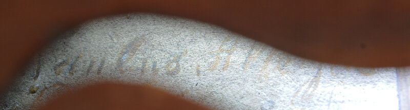 Signatur: Handbeschriebener Zettel auf dem Boden im Korpusinneren. Nur die erste Zeile lesbar: