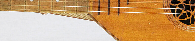 Lautenhals mit Griffbrett. Insgesamt 14 Bundstäbchen; neun auf dem Griffbrett (Metall, eingeschlagen), fünf (Holz) auf der Decke, die beiden höchsten verkürzt)