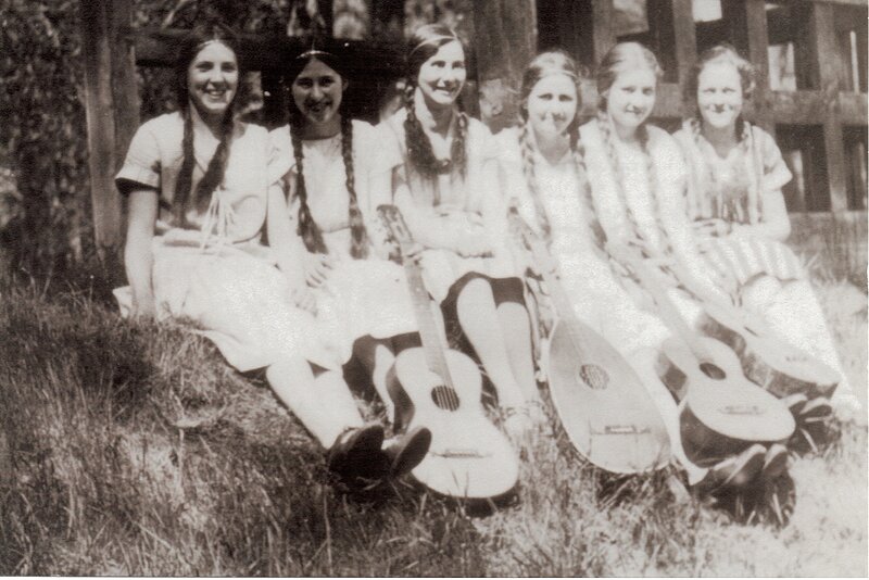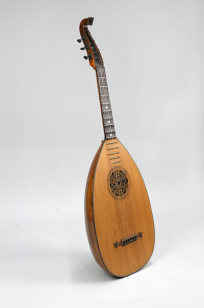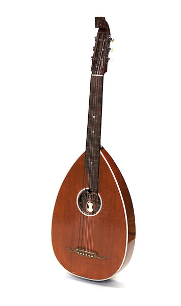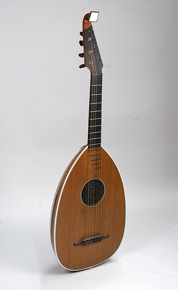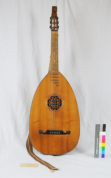 Aufgespannt sind sechs Gitarrensaiten in umgekehrter Folge für linkshändiges Spiel. Das nebenstehende Bild zeigt die ehemalige Besitzerin der Gitarrenlaute (4. von rechts), Walpurga Liese, Tante des Stifters, daneben (5. von rechts, mit Gitarre) ihre Schwester Margarete Berndt (geb. Liese; Mutter des Stifters). Die anderen Frauen mit Gitarre sind (3. von rechts) Elisabeth Berndt/Felgentreu und (6. von rechts) Elke Schulz/Berndt. Die vier Frauen waren Ende der 1930er Jahre verwandt/verschwägert und in Schmargendorf ansässig. Aufgenommen wurde das Bild Ende der 1920er Jahre, wahrscheinlich im Grunewald.