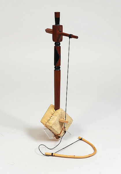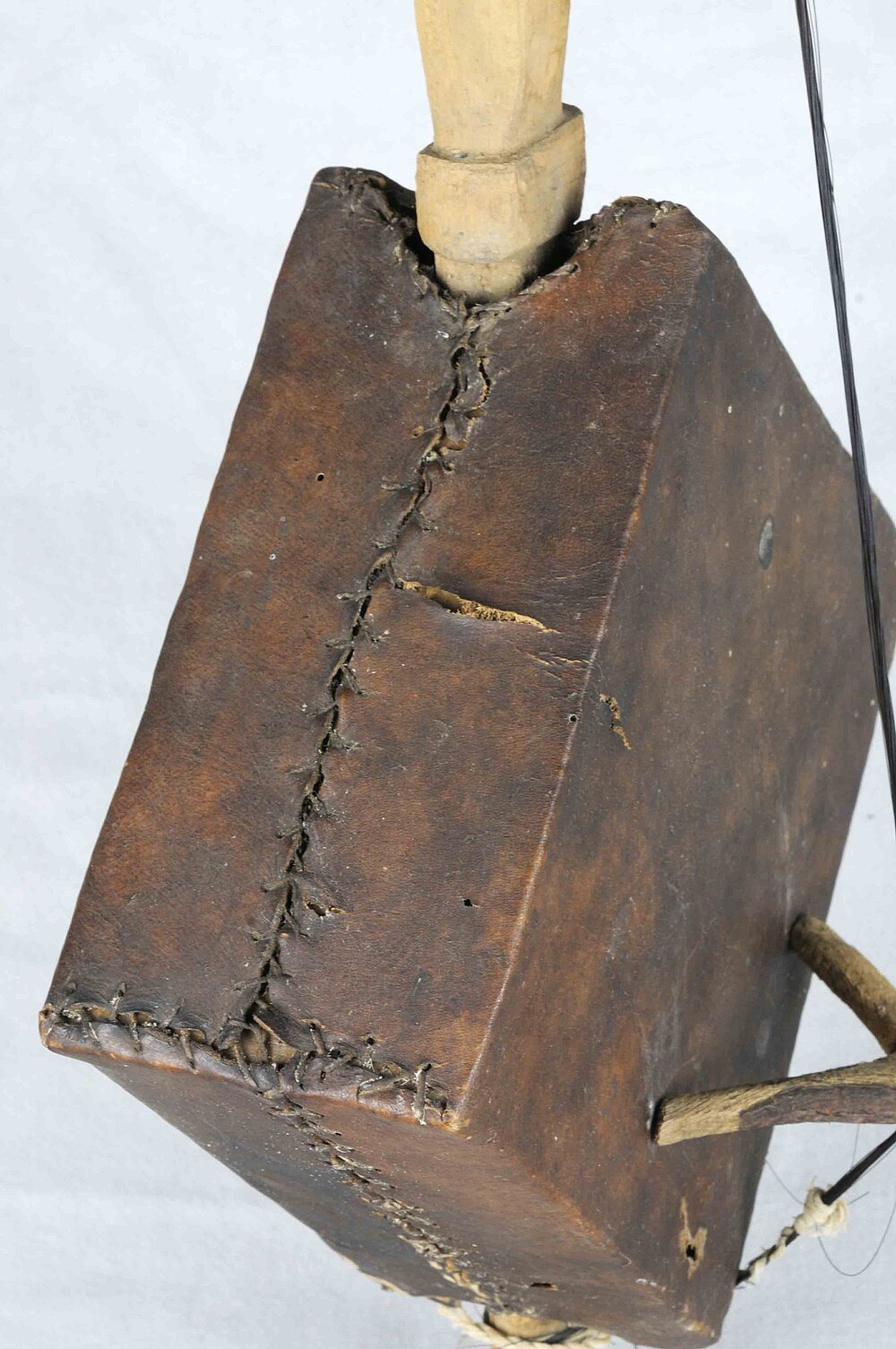 Spießlänge 80 cm; Resonator 23,5 x 14 cm; Bespannung: helle ungebeizte Kuhhaut.