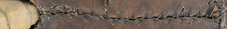 Mit dunkel gebeizter Kuhhaut bespannt, vernäht entlang der Mitte der unteren Seiten und entlang der seitlichen Kanten.