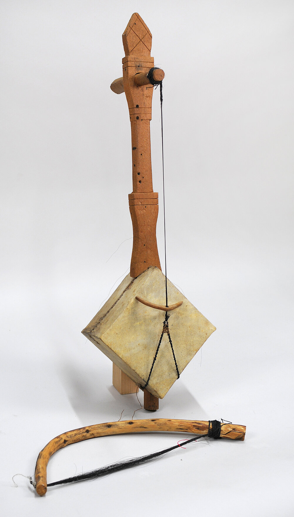 Saitenbespannung: weißes Rosshaar, hinter dem Steg an einer Schnur befestigt, die in Y-Trennung zum Spießende verläuft. Am Wirbel mit Lederbespannung befestigt.