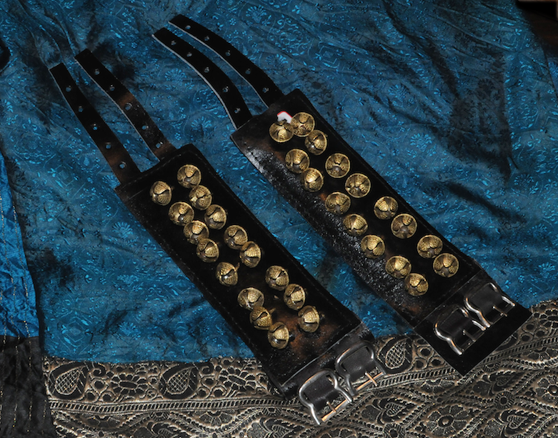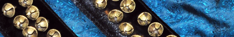 StW 3e-h: Ghungrus [Ghunghroos; ankle bells] für Bharatnatyam (Fußglöckchen für Tanz; Bild vor blauem Hintergrund). Beim indischen Tanz werden meist um die Fußgelenke Ghungrus getragen um die rhythmischen Bewegungen der Füße akustisch zu verstärken. Je mehr Glöckchen und je besser ihre Klangqualität, umso mehr unterstreicht ihr Klang den Rhythmus des Tanzes. Mit geringem Nachklang geben sie präzise die rhythmische Bewegung der Füße beim Tanz wieder. Bild unten (v.r.n.l.)