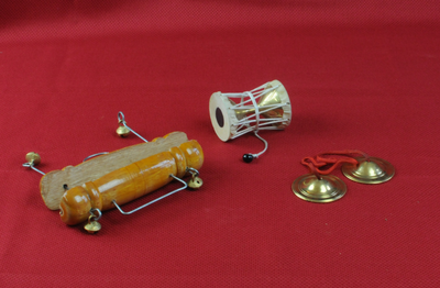 Manjiras: Indische Zimbeln (StW 3f), einfache Ausführung aus Messing, gedreht, das Paar an der Schnur. Damaru (StW 3g): Handtrommel in Form einer Sanduhr. Karthals (StW 3h): Holzblöcke zum Aneinanderschlagen in der Hand, Draht-Daumenführung und -Fingerführung, mit Glöckchen an den äußeren Metalldrahtführungen.