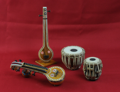 StW 3a–c: Holzmodelle der Langhalslauten Tanpura und Sarasvati Vina, ferner Tabla-Set. Tanpura: Mit 4 bzw. 5 Metallsaiten (selten mit 6 Saiten) bespannt und als Grundtoninstrument wichtiger Bestandteil in der klassischen Indischen Musik. – Tanpura: Borduninstrument, Saiten werden nur gezupft, nicht gegriffen. Gestimmt werden Tanpuras i.d.R. auf den Grundton und dessen Quinte und Oktave. Die Saiten werden nicht gegriffen, sondern nur gezupft [vgl. StW 5]. Sarasvati Vina: Sie ist eine der wichtigsten klassischen Soloinstrumente in der südindischen karnatischen Tradition, ähnlich aufgebaut wie die Sitar. Im Unterschied zur dieser besitzt die Sarasvati Vina keinen Kürbis als Resonator. Saiten: 4 Spielsaiten und 3 Bordunsaiten. Das Instrument wird aus einem Stück Holz gefertigt, auch der Resonator besteht aus massivem Holz. Der Hals ist schmäler als bei der Sitar, daher können die Saiten seitlich nicht so weit gezogen werden wie bei der Sitar. Die Bünde sind in ein Bett aus Wachs gegossen und die Brücke hat eine metallene Oberfläche, deren Schliff den schnarrenden und obertonreichen Ton des Instruments bestimmt. – Tabla-Set aus Ton, Fell, Stoff mit Bayan (Basstrommel) und Dayan (hohe Trommel mit Stimmklötzchen).
