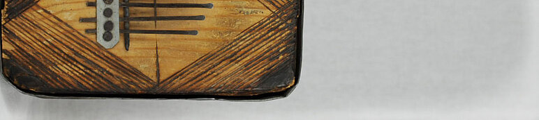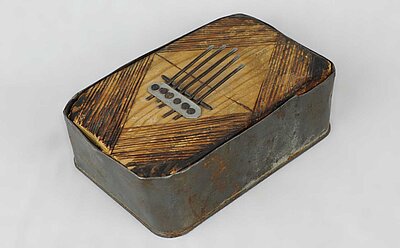 Lamellenträger/Resonanzplatte: Holzplatte (Fichte, wohl Palettenholz, 18 mm), angepasst an Fischkonservendose mit nach innen geknicktem Rand, die als Resonator fungiert. Auf der Holzoberfläche ornamentale Einritzung in parallelen Linien, so dass in der Mitte eine geteilte Raute frei bleibt.