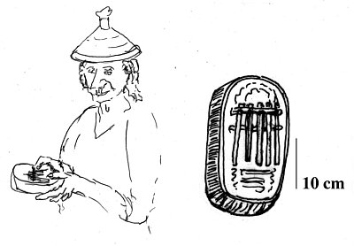 Schulz hat einen Mann aus dem Volk der Fulbe (erkennbar an dem malafaare genannten Strohhut) gezeichnet, der diese Art kalimba – die Bezeichnung auf Fulfulde war nicht zu ermitteln – spielt.