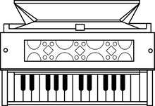 Es handelt sich um ein einfaches Instrument ohne Registerschaltung. Ausgesägtes florales Muster. Blasebalg mit einer Falte, freies weißes Grasornament auf Grün.