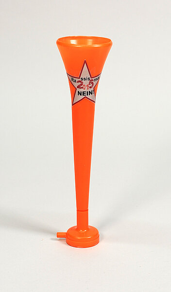 Auf dem Trichter ein sternförmiges matt silbernes Etikett mit rotem Rand und der Aufschrift "Rassismus 2015 NEIN!"