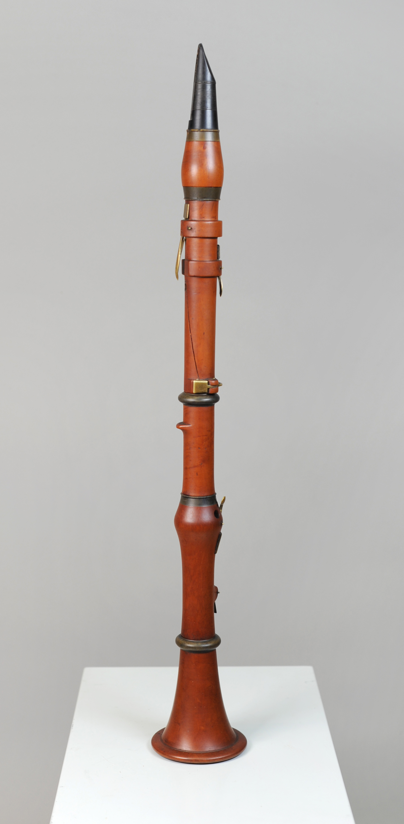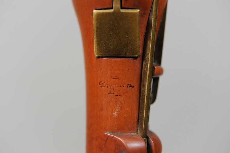 Schäden: Riss zwischen Daumenloch und drittem Fingergriffloch in der Rückseite des Oberstücks. Riss unter dem Daumenhebel zwischen den Profilringen des Mittelstücks.