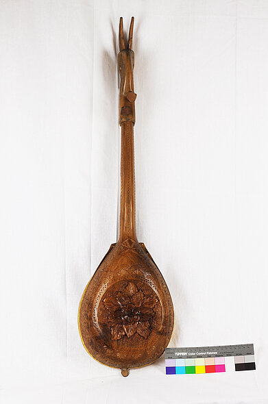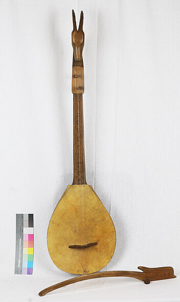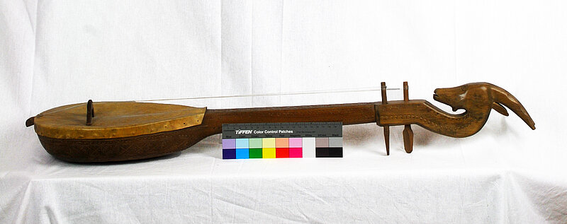 Die aktuelle Schaubesaitung (Januar 2015) von Bogen und Saiten besteht aus Nylon und weist auf den Verwendungszweck des Instruments als Dekorationsmaterial. An der Halsseite löst sich die Membranbespannung. – Das Instrument wurde anonym gestiftet.