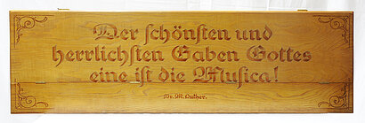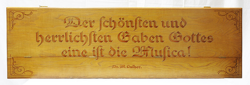 Erworben wurde das Instrument durch die Eltern der Stifterin 1949. Die Verzierungen, Luther-Sprüche (Lack- und Blattgoldauftrag) und wohl auch die Ornament-Papierbeklebung auf den Wandinnenseiten bis zur Profilleiste auf der Resonanztafel, stammen von der Stifterin des Instruments.
