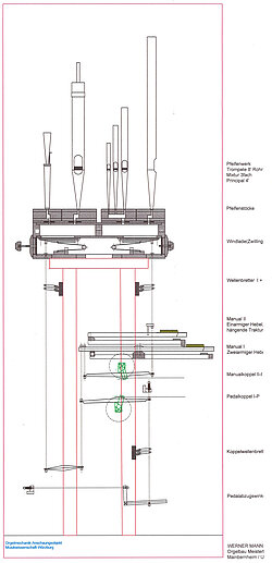 Mit zwei Manualen (jeweils Unter- und Obertaste), Pedal, Manual- und Pedalkoppel, mechanische Spiel-Trakturen, Zwillings-Windlade. Das auf einem Wagen montierte Modell wurde 2016 dem Institut angeboten und 2017 gefertigt durch Werner Mann (Orgelbau-Meisterbetrieb Mainbernheim). Das Modell hilft in der Lehre, die nicht-sichtbaren Teile der Orgel W1 zu verstehen.